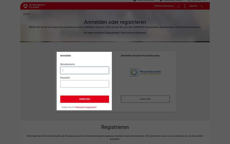Du wirst das Formular gleich direkt online zur Bundesagentur für Arbeit übertragen. Dazu benötigst du einen Zugang zu den eServices der Arbeitsagentur.