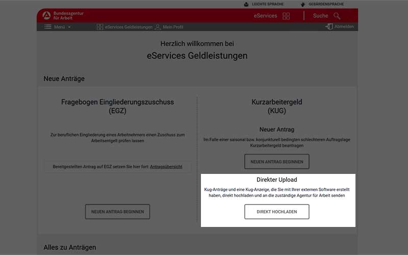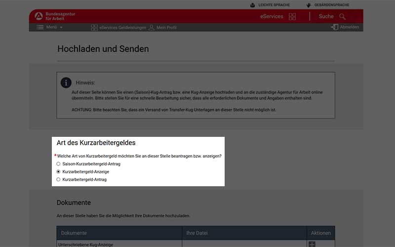 Wähle nun "Kurzarbeitergeld-Anzeige" aus und folge den weiteren Anweisungen auf dem Bildschirm. Fertig.