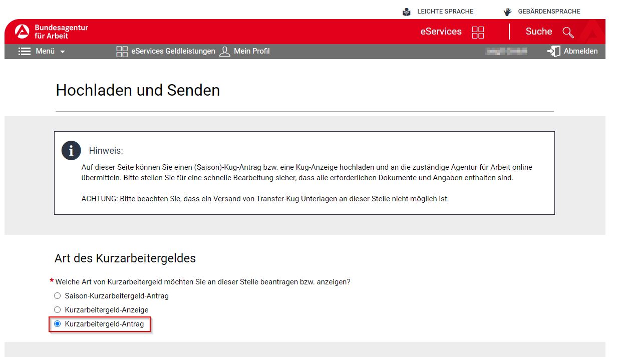 Wähle nun "Kurzarbeitergeld-Antrag" aus und folge den weiteren Anweisungen auf dem Bildschirm. Fertig.